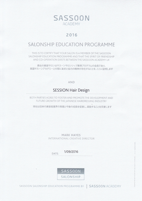 さらに今回は、特別にとても嬉しい事がありました。8月のロンドンSASSOON研修にて行われた、コレクションの作品紹介の為オーナースタイリストの南がステージに立ち、さらに、コンテスト終了後にはオーナースタイリストの南の長年に渡るSASSOONへの想いや功績を認めて頂きDIPLOMA(認定証)の授与式もありました。(日本でも限られたサロンにしかない貴重なDIPLOMAです。)