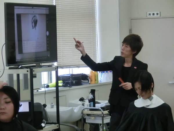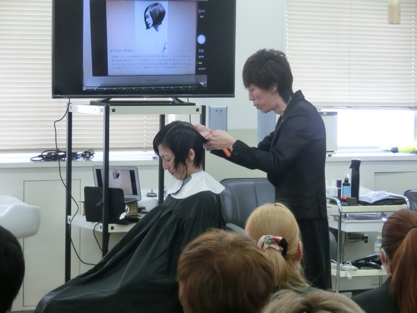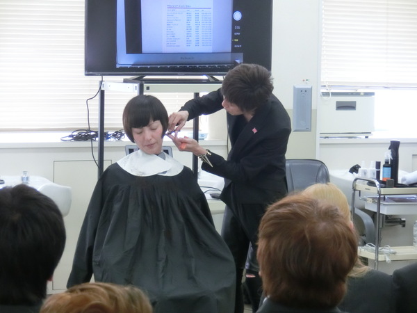 最初の授業は、ヘアカットがどの様にされているのかを、見て頂き知って頂くために、デモンストレーションを行いながらヘアカットの説明をして行きます。